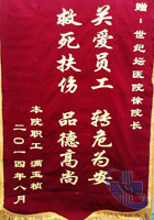 2014年11月,共19面:从左至右依次是:臧奇大夫及急诊科全体医护人员,ICU全体医护人员,中医骨伤科葛凤麟大夫,普外三病区刘玉超大夫,普外三区王岩主任,骨外一科全体,血管外科冯亚平医生及全体医护人员,妇科李红霞、李付英,肿内二区全体医护人员,干部门诊李红医师,干三呼吸科郭蕊大夫及全体医护人员,呼吸科方秋红主任,内分泌科程飞大夫,内分泌科全体医护人员,内分泌科宋秀霞大夫及全体医护人员,风湿免疫科赵绵松主任,针灸科李智医生,整形修复门诊韩修武主任医师、吴顺香治疗师及全体同仁,医务处王莉主任。